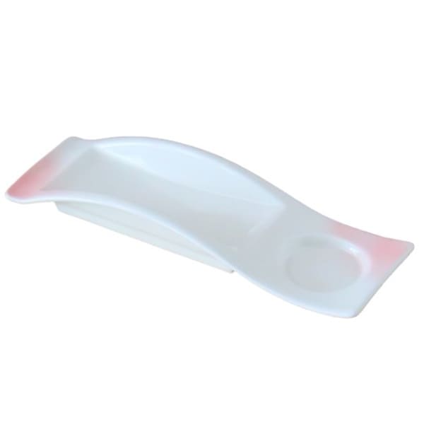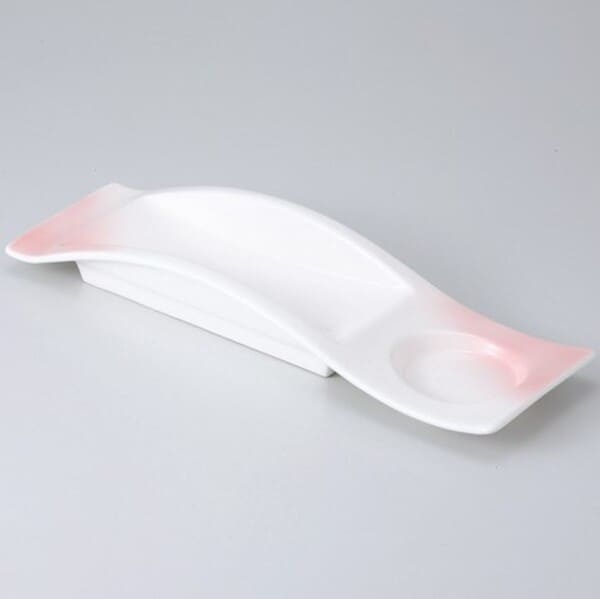 上下に波を描いた形が印象的な付出し皿です。やわらかい乳白色に淡いピンク色を吹き付けた、やさしい色合いです。