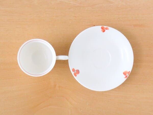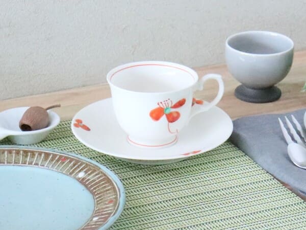 高台がついた薄手で外に広がったカップは口になじみやすく、上品な雰囲気が感じられる形です。白磁に映えるハンドペイントの小さな和の花柄は、いつもと違うティータイムを演出します。